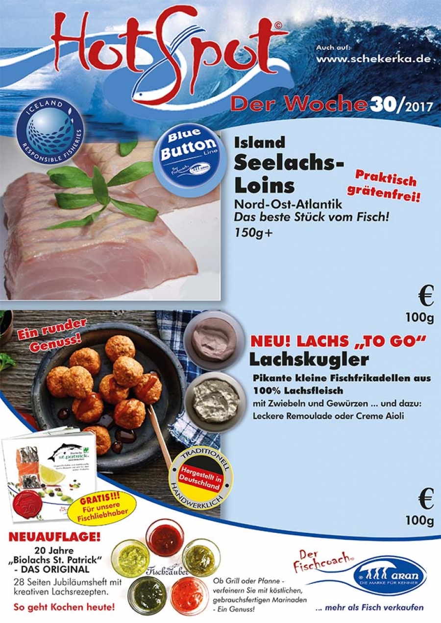 An dieser Stelle findet ihr nun endlich auch hier unsere wöchentlichen Angebote, die ihr bei eurem guten Fischhändler findet oder in Märkten mit Fischtheke, die unsere Marken führen. Auch als Selbstbedienungsware sind viele unserer veredelten (z.B. geräuchert oder mariniert) Markenartikel in eben diesen Läden/Märkten zu finden. Fragt einfach nach den "Aran-Marken", z.B. St. Patrick Biolachs, Connemara Atlantik-Lachs, Norsjela - Die Seele Norwegens (norwegischer Lachs) und auch Prinz Wildlachs.