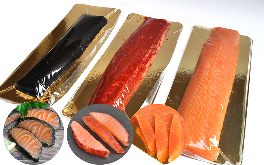 Dieses wunderbare Stück Lachs lässt sich herrlich verarbeiten und veredeln. Die einfachste köstliche Variante ist das natur geräucherte Lachs-Loin. Aber es geht noch spezieller! Lachs-Loin mit Rotholzauflage (geräuchert und mariniert), und für alle Sushi-, Sashimi- und überhaupt Asiafood-Fans gibt es Lachs-Loin geräuchert mit feiner Wasabinote im Noriblatt-Mantel.
