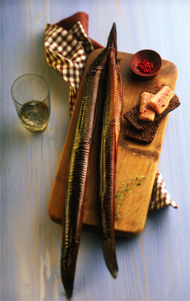 Der Aran-Aal wird nach sorgfältiger Hege lebend-frisch bei uns aus den Hälteranlagen gefangen und nach alter Tradition handwerklich veredelt. In einer milden Salzlake reifen die naturbelassene Aale, um danach im ALTONAER OFEN bei 60°-75°C über lebendigem Feuer, bei ständiger Aufsicht durch den Räuchermeister, geräuchert zu werden.